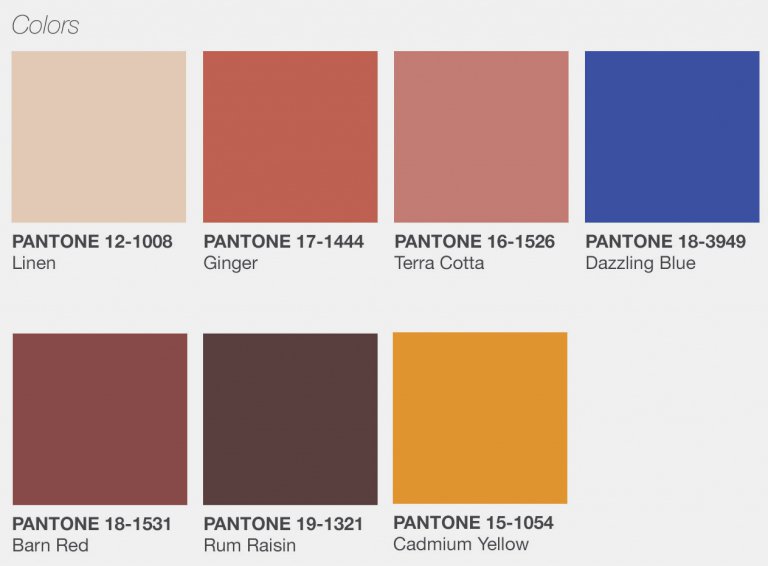 Son tonos muy naturales, especialmente destacan los colores tierra: el lino, jengibre, terracota, rojo granero, azul deslumbrante y el amarillo cadmio. Colores que evocan la madera, la tierra y otros elementos naturales.